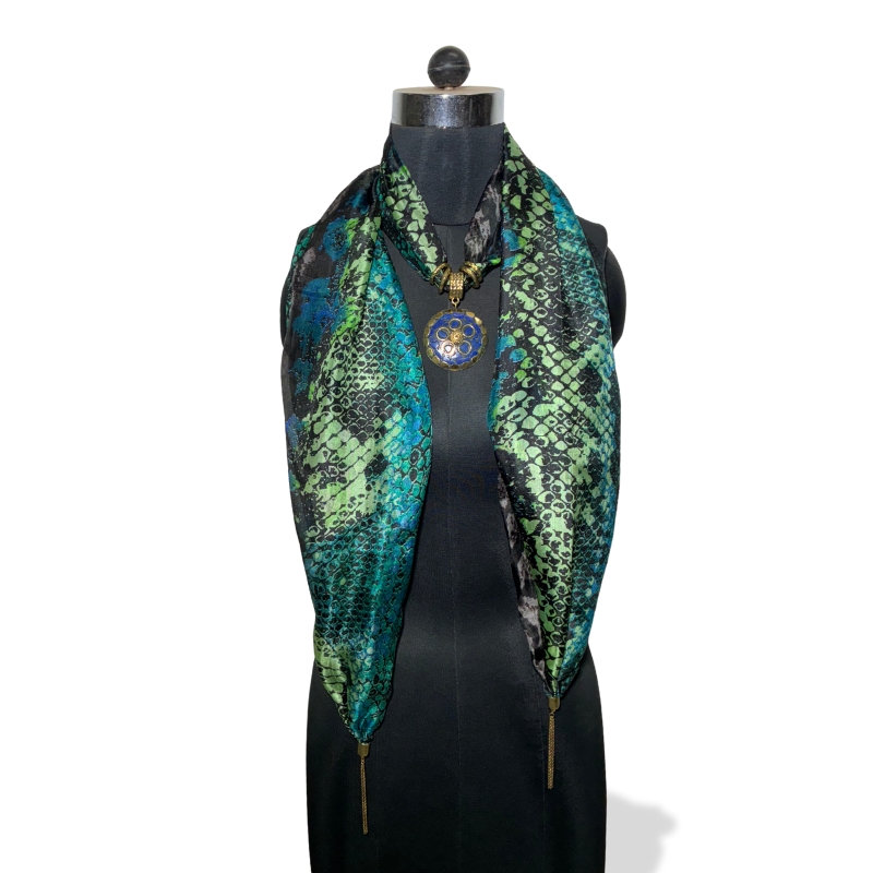 - Pure silk stole with reptile-inspired green, black, and teal pattern