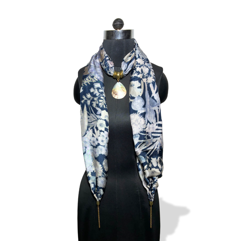 A tribute to twilight beauty, Nocturne Garden features a sophisticated navy blue base with soft ivory floral patterns—evoking the calm of a moonlit garden. The stole is complemented by a natural round shell pendant with luminous iridescence, suspended from a classic antique gold loop. It’s the perfect blend of elegance and organic charm—lightweight, luxurious, and effortlessly statement-worthy.