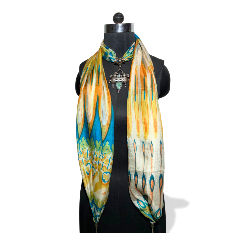 Peacock Prism is for the days you don’t want to blend in. With bright yellow, teal, and forest green hues melting into a feather-inspired print, this stole makes every outfit come alive. The oxidised silver pendant with mint green detailing brings a tribal soul to this vibrant canvas—making it perfect for ethnic pairings or statement fusion wear.