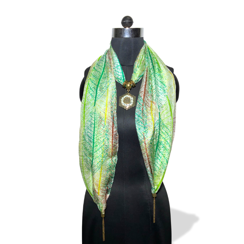 Rainforest Whispers is where the quiet of nature meets the voice of fashion. This silk stole features finely detailed leaf prints in forest green, lime, and touches of earthy browns — reminiscent of tropical walks and dewy mornings. The mirror pendant at its heart adds a flash of folk elegance, while the fabric keeps things light, breezy, and comfortable.